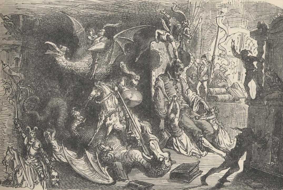 The book cover and spine above and the images which follow were not part of the original Ormsby translation—they are taken from the 1880 edition of J. W. Clark, illustrated by Gustave Doré. Clark in his edition states that, “The English text of ‘Don Quixote’ adopted in this edition is that of Jarvis, with occasional corrections from Motteaux.”